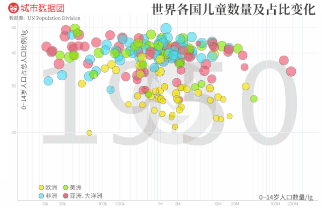 在这张图上,代表欧洲的黄点不断“下沉”,意味着儿童数量变化不大、比例却降低得很快。而在非洲(蓝色),除了突尼斯、塞舌尔和毛里求斯等少数富裕国家以外,绝大多数国家都实现了儿童数量和比例的“双增加”。