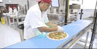 Pizza的制作过程中并不是完全无人化,还需要工作人员部分参与。比如把酱料洒在生产线上。