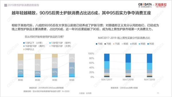 “精致护肤”成趋势。根据第一财经商业数据中心(CBNData)联合天猫美妆发布《2019男性护肤消费趋势报告》显示,95后成为线上男性护肤领域的第一大金主。“95后精致Boy”已然成为趋势,Z世代在护肤消费上越来越舍得投入。
