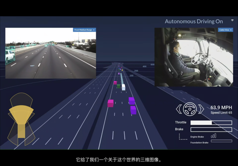 图森使用相机作为主要传感器,每个相机每秒钟采集20-30帧,大概100MB的数据,这些数据通过多层的深度学习网络,获得一些结果。这些结果再和算法合并起来,根据卡车的自我信息、速度和角度做出实时决策,比如哪里有其他车辆或是障碍物,或者探测车道等。