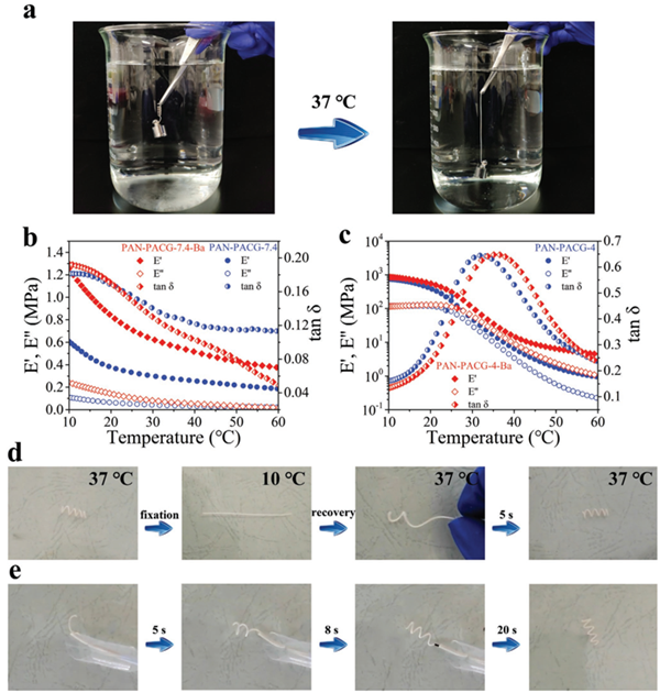 该水凝胶材料由丙烯腈(AN)、N-丙烯酰2-甘氨酸(ACG)、交联剂聚(乙二醇)二丙烯酸酯(Mn=700,PEGDA700)共聚而成(如图1所示)。除了氰基之间可以形成可逆的偶极-偶极相互作用,酸性条件下(pH4),ACG的羧基可以完全质子化,造成网络中大量可逆氢键的形成,从而赋予水凝胶热响应的能力。这两种物理作用力的同时存在大大增强了水凝胶的力学强度,使SMH能在体温触发下实现从直条到原始线圈状的明显收缩。在中性的血液微环境中,羧基之间氢键的部分解离,使得水凝胶线圈在适当的时间范围内溶胀,以实现高填充密度。此外,氰基之间的偶极-偶极相互作用可以增加ACG的稳定性,使水凝胶在体液环境中保持线圈形状,避免其从动脉瘤中脱落。