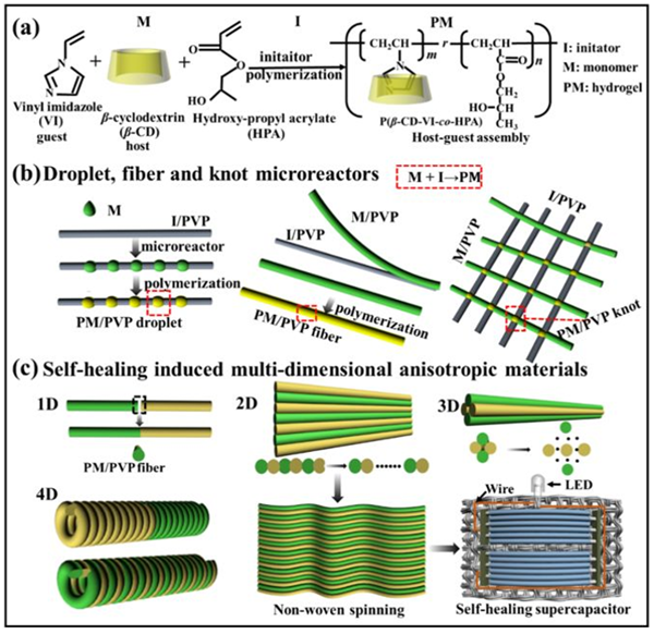 如何通过简单的方式将一维(1D)纤维材料转变成多维有序结构材料具有重要的研究和应用意义。陈苏教授课题组基于微流控纺丝原位合成自愈合凝胶纤维,并利用原纤维间的自愈合作用力实现了1D纤维到多维织物的编织。微流体纺丝技术由于其简单,高效,灵活的可控性和环境友好的化学过程为凝胶纤维和纤维微反应器的连续化构造提供了强大的平台。基于主客体作用力,借助原纤维间的固有的超分子作用力,实现了多维纤维织物的简单快速构筑,织物具有良好的柔性、可拉伸性能和较高的机械性能。此外,研究者将凝胶纤维与导电纳米材料相结合,利用该方法成功制备了自愈合复合导线和超级电容器。这项研究成果为多维纤维结构材料的设计和快速构筑提供了一种新思路。