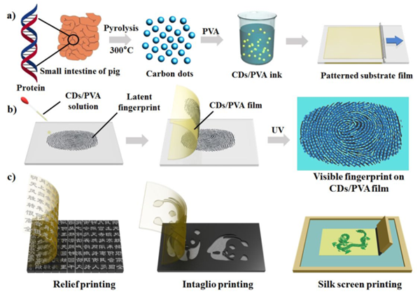 针对目前对碳量子点应用局限的难题,陈苏教授课题组将碳点/聚合物复合材料作为无墨图案化基质,可实现提取以及识别潜指纹。与传统的指纹提取方法相比,该方法不仅无毒安全能够在多种材质表面上有效提取指纹,还能够避免材质表面颜色对指纹识别的干扰。基于碳点/聚合物复合材料在指纹提取与识别的原理,该复合材料还能应用于凹版与凸版印刷工业,为指纹提取识别和绿色印刷产业提供了新思路。