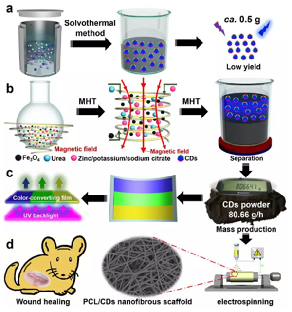 作为碳材料的一种,碳量子点以其优异的物理化学和光学性能,引起了研究者们的广泛关注。碳量子点具有无毒、廉价、原料来源广泛等优点,在生物、能源、显示等领域有重要的应用前景。然而,目前碳量子点品种与制备方法单一,传统的溶剂热、微波合成等方法反应速度慢、转化率低,无法实现碳量子点的大规模制备。因而,如何开发新工艺,实现低成本大规模快速制备碳量子点成为此领域极富挑战的课题之一。陈苏教授课题组创新地采用磁热反应器,快速热解柠檬酸盐和尿素,在三分钟内一步法快速制备了荧光碳量子点。通过优化反应条件,可以在一小时内得到多达80g碳量子点粉末(产量比传统方法提高近160倍)。与普通反应器相比,磁热反应器能量高,温度升幅快且温度稳定性好,受热均匀,整个反应过程从接触式反应转变为非接触式反应,安全高效。该方法不仅为碳量子点材料的合成提供新思路,还极大促进了碳量子点的产业化发展。