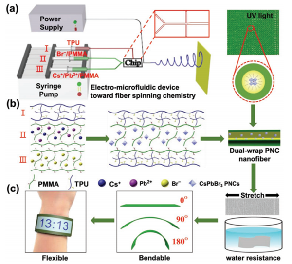 利用外场作用构筑微纳纤维一直是国内外研究热点之一。特别是以静电纺丝为代表的一维微纳纤维以其纤维易得、纤维直径小等优异特性在近二十年受到广泛关注。然而,静电纺丝过程是一个物理过程,很难发生化学变化。陈苏教授课题组开发出微流体静电纺丝机用于构筑全无机卤化物钙钛矿纳米晶(PNCs)掺杂的聚合物材料。创新提出纤维纺丝化学(Fiber-spinningchemistry,FSC)的新概念,即在微纳纤维受限空间中原位实现PNCs在纤维中的生成。一方面,该方法解决了PNCs水稳定性差的难题;另一方面,提出了一种合成PNCs全新的FSC新方法;同时,此方法环境友好,大大降低了挥发性有机化合物(VOCs)的排放,所制备的PNC耐水性大大提高,在大气中储存90天后,PNCs /聚合物纤维膜在光致发光(PL)中保持恒定,并且在水浸泡120小时后保持82%PL。