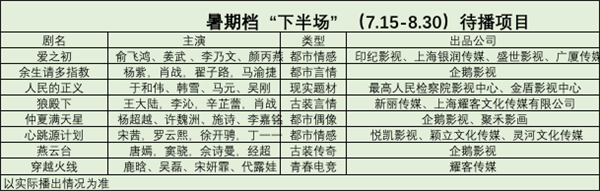 值得一提的是,今年暑期档“上半场”,截至目前,播出过的古装剧仅为三部,“下半场”古装剧的集中爆发,也会是接下来市场中的一大看点。