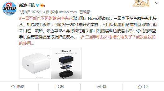 妥妥的苹果与消费者双赢啊,要不是后来三星选择了跟牌,我还真的就差点信了!在苹果被传出不再标配充电头不久后,三星也被曝出消息说要在2021年把充电头砍掉。