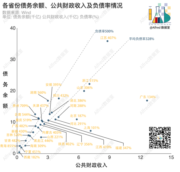由图可见,各省份平均负债率为328%,上海、广东、西藏、北京等负债率较低(低于200%),而青海、贵州、湖南、云南、重庆等负债率较高。特别是青海和贵州,负债率分别为855%和709%。综合来看,经济较为发达的省份,财政收入较高,负债率较低,而经济较为落后的省份,财政收入较低,负债率普遍偏高。