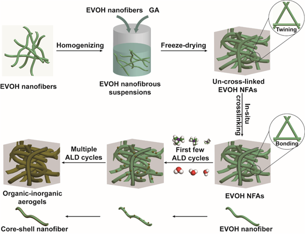 日前,东华大学肖茹教授团队利用熔融共混挤出相分离法将热塑性高聚物树脂纤维化、纳米化,通过冷冻干燥和化学原位交联构筑力学性能良好的乙烯乙烯醇共聚物(EVOH)纳米纤维气凝胶,并以其为模版,三甲基铝(TMA)和水为铝源、氧源,经原子层气相沉积(ALD)于气凝胶表面引入氧化铝(Al2O3)颗粒,制备表面润湿性可控的有机-无机复合纳米纤维气凝胶。