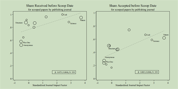 当然被抢发的论文也有可能登上 CNS,但是这些论文中有 90% 是在评审阶段被抢发的;即便是被抢发的论文发表在 PLoS One 之类的期刊,评审期间被抢发的也占将近 60%。