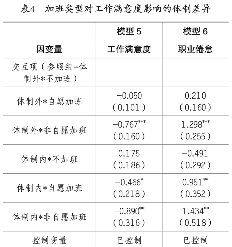 假设2:加班行为对当代青年工作满意度的影响会受到体制因素调节。具体而言,在控制其他变量的情况下,加班行为对体制内就业的青年工作满意度的影响要强于体制外就业的青年。