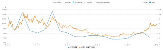 Wind数据显示从户均持股数来看,22年以来随股价下探而减少,25年经历了先升后降的趋势,可转债转股后,控股股东持股有所稀释。但我们也观察到,基金的持股比例由年初的12.59%提升至13.36%,增持3925.72万股。考虑到季报仅公布前十大股股票明细,实际持仓或更高。