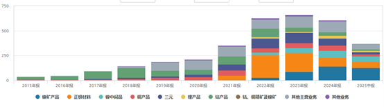 从主营业务收入来看,华友钴业在2018年以前都是以钴产品为主,2019年起锂电新材料放量,即三元前驱体、锂产品、镍产品等。