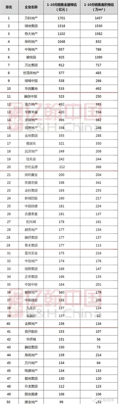 2014年1至10月中国房企销售业绩排行榜TOP50