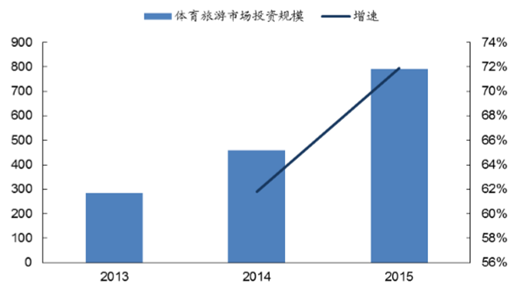 在中国,旅游产业已经是中国转型升级期的重点,目前规模已经超过4万亿;而体育产业也属于文化产业的重要支柱,目前规模在3万亿左右,体育旅游在中国的市场想象空间巨大。根据中信建投报告中的测算,目前我国体育旅游规模为1700亿,仅占旅游行业总规模的5%,如果在将来达到发达国家平均25%的比例,以旅游产业4万亿的规模为基础,体育旅游规模可达1万亿。事实上,资本也在快速进入该风口,2015年国内体育旅游实际完成投资为791亿元,同比增长71.9%。
